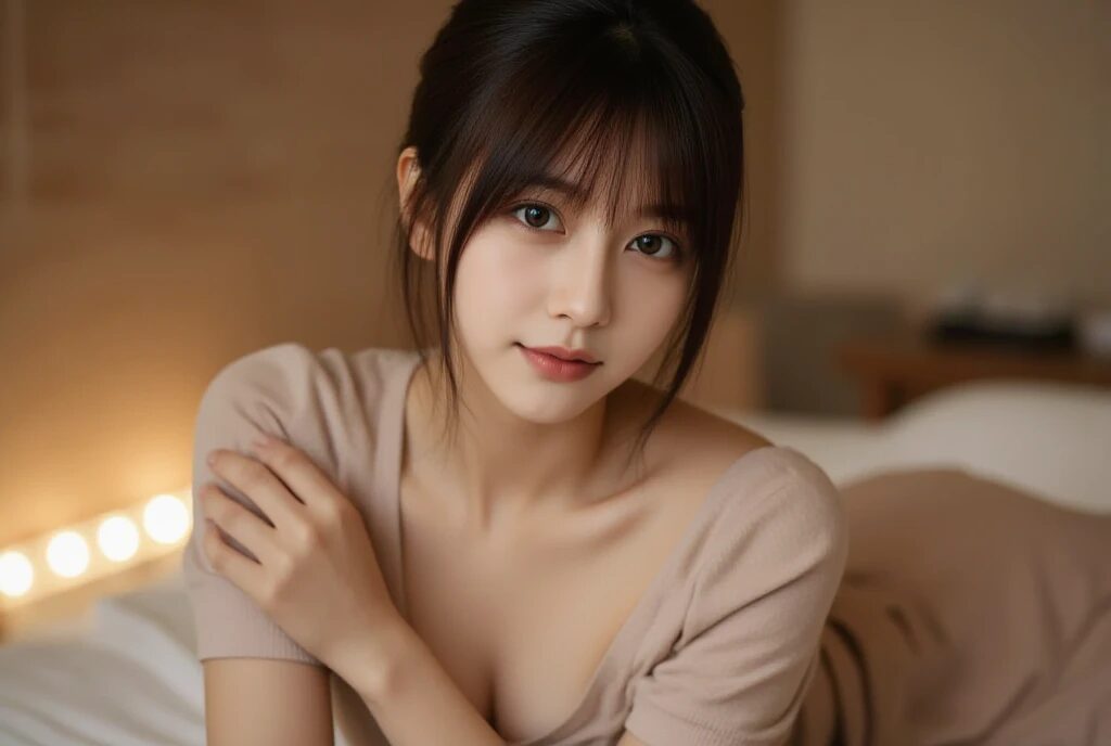 彼女の見た目は本当に目を引きます。キメ細やかで白い肌が輝きを放ち、大きな瞳はくっきりとした二重で、まつげが長くて目元が強調されています。